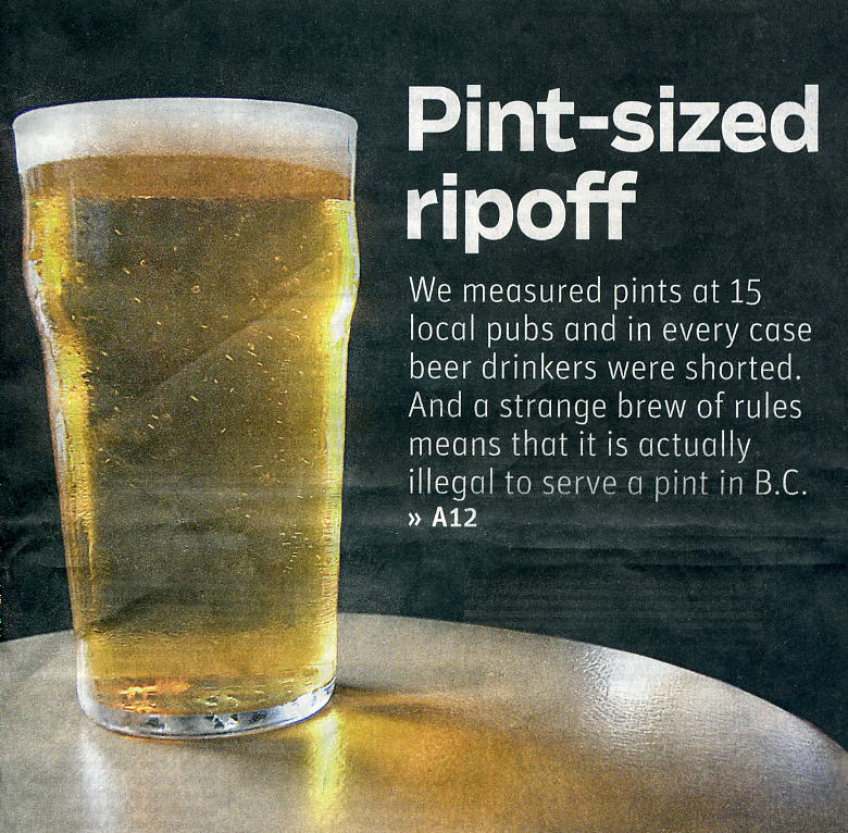 The concoction of provincial and federal laws means no pub can legally lay claim to selling a pint in B.C. A pub that pours a full 20 ounces meets the federal requirement, but runs afoul of provincial law. A pub that pours 17.5 ounces or less stays within the provincial limit but breaks the federal law. In other words, pubs that want to obey both laws should not be advertising pint sales at all and would be better off to simply state the size of their draft servings so customers know in advance what they are getting.