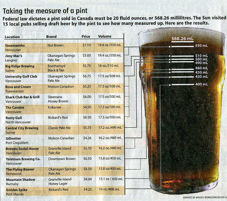 The Vancouver Sun tripped across the contradictory regulations while conducting a random survey of 15 pubs in Metro Vancouver to determine just how much beer customers receive when ordering a "pint". The Sun found pubs served 17 ounces on average, representing a three-ounce or 15-per-cent discrepancy. The Golden Spike in Port Moody served the smallest amount at 14 ounces, followed by 15.1 ounces at the Mountain Shadow in Burnaby. Two pubs that effectively served the legal limit included Steamworks in Vancouver and Jimy Mac’s in Langley at 19.4 ounces. The Sun surveyed only pubs that advertised “pint” sales on their menus or where servers verbally confirmed the establishment served pints.