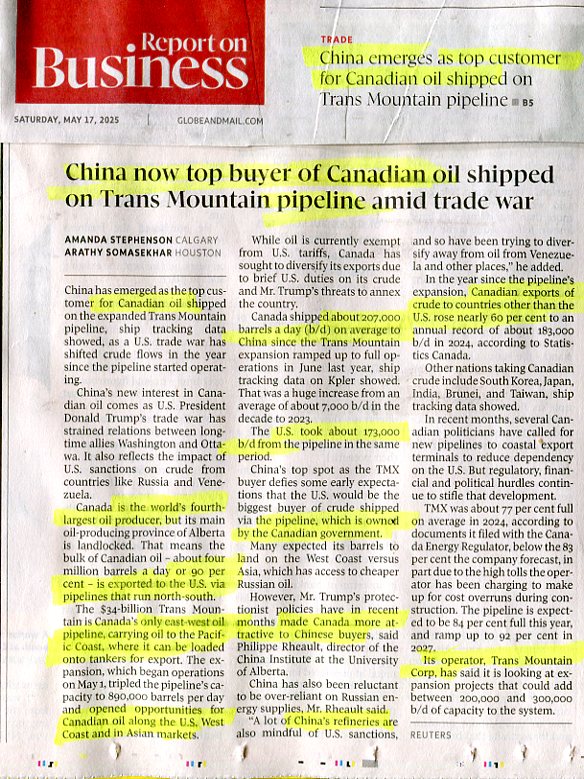 China now top buyer of Canadian oil shipped on the newly completed (2024) Trans Mountain pipeline (TMX) amid USA trade war, Globe Mail, May 17, 2025