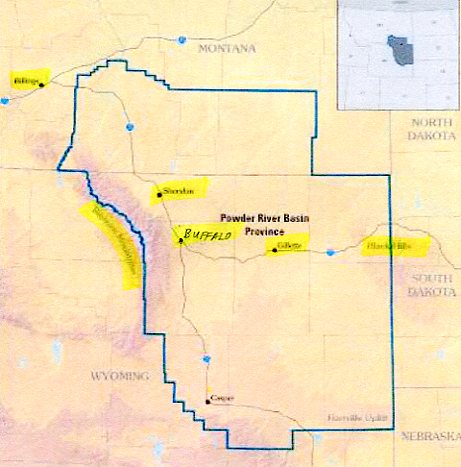 "...The Powder River Basin is a geologic structural basin in southeast Montana and northeast Wyoming, about 120 miles east to west and 200 miles north to south, known for its extensive coal reserves. The former hunting grounds of the Oglala Lakota, the area is very sparsely populated and is known for its rolling grasslands and semi-arid climate.... The major cities in the area include Gillette and Sheridan, Wyoming and Miles City, Montana. In 2007, the region produced 396 million tonnes of coal, more than twice the production of second-place West Virginia, and more than the entire Appalachian region. The Powder River Basin is the largest coal-producing region in the United States. The region includes the Black Thunder Coal Mine, the most productive in the United States, and North Antelope Rochelle Mine, the second most productive..."
