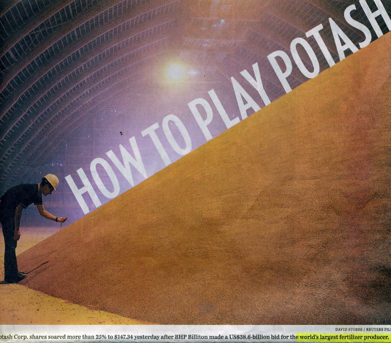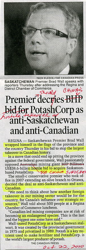 Finally, last week, the top politician of the province of Saskatchewan (where Canada's supply of potash is located) spoke out againt its "hostile takeover" by a foreign country. He's talking about the bid by an Australian company BHP and not the rumoured so-called "friendly" bid by a "white night" Chinese company Sinochem which is forming partnerships behind the scenes, including with Canadian Indians. But otherwise the premier's sentiments are right on (and I've substituted China for Australia where indicated):