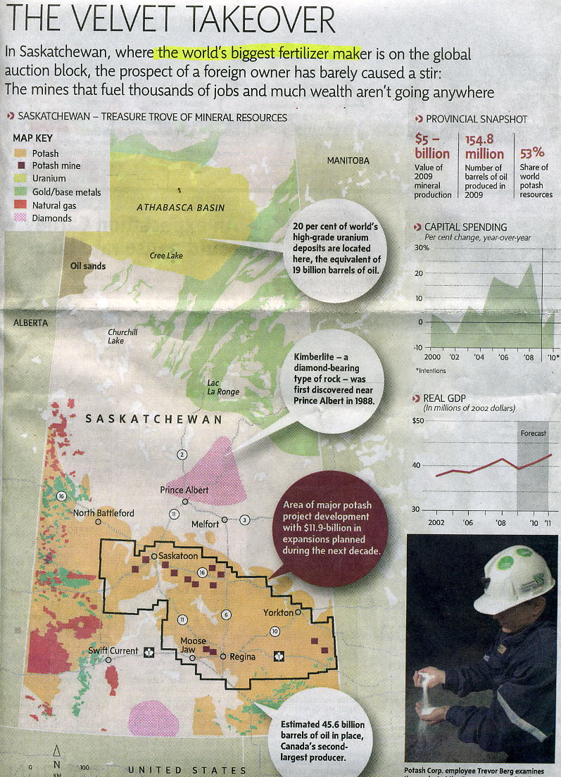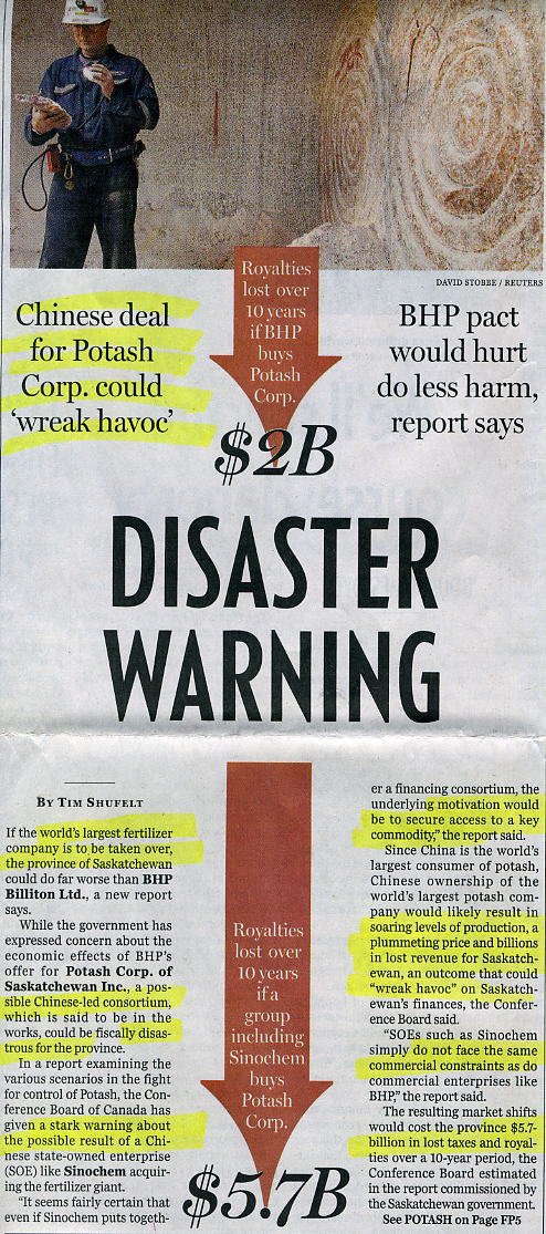 Chinese deal for Potash would wreak havoc, Financial Post, Oct 5, 2010 (If the world's largest fertilizer company is to be taken over, the province of Saskatchewan could do far worse than [Australian] BHP Billiton Ltd, a new report says. While the government has expressed concern about the economic effects of BHP's offer for Potash Corp of Saskatchewan Inc, a possible Chinese-led consortium, which is said to be in the works, could be fiscally disastrous for the province. In a report examining the various scenarios in the fight for control of Potash, the Conference Board of Canada has given a stark warning about the possible result of a Chinese state-owned enterprise (SOE) like Sinochem acquiring the fertilizer giant. "It seems fairly certain that even if Sinochem puts together a financing consortium, the underlying motivation would be to secure access to a key commodity", the report said. Since China is the world's largest consumer of potash, Chinese ownership of the world's largest potash company would likely result in soaring levels of production, a plummeting price and billions in lost revenue for Saskatchewan, an outcome that could "wreak havoc" on Saskatchewan's finances, the Conference Board said....)