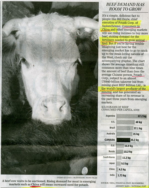 A beef cow waits to be auctioned. Rising demand for meat in emerging markets such as China will mean increased need for potash. It's a simple delicious fact to people like Bill Doyle, chief executive of Potash Corp of Saskatchewan: Consumers in China and other emerging markets will use rising incomes to buy more beef, stoking demand for the fertilizers needed to grow animal feed....Potash Corp, subject to an almost US$40-billion takeover bid from [Australian] mining giant BHP Billiton Ltd is the world's largest producer of the mineral, and has generated an increasing share of its revenue in the past three years from emerging markets.
