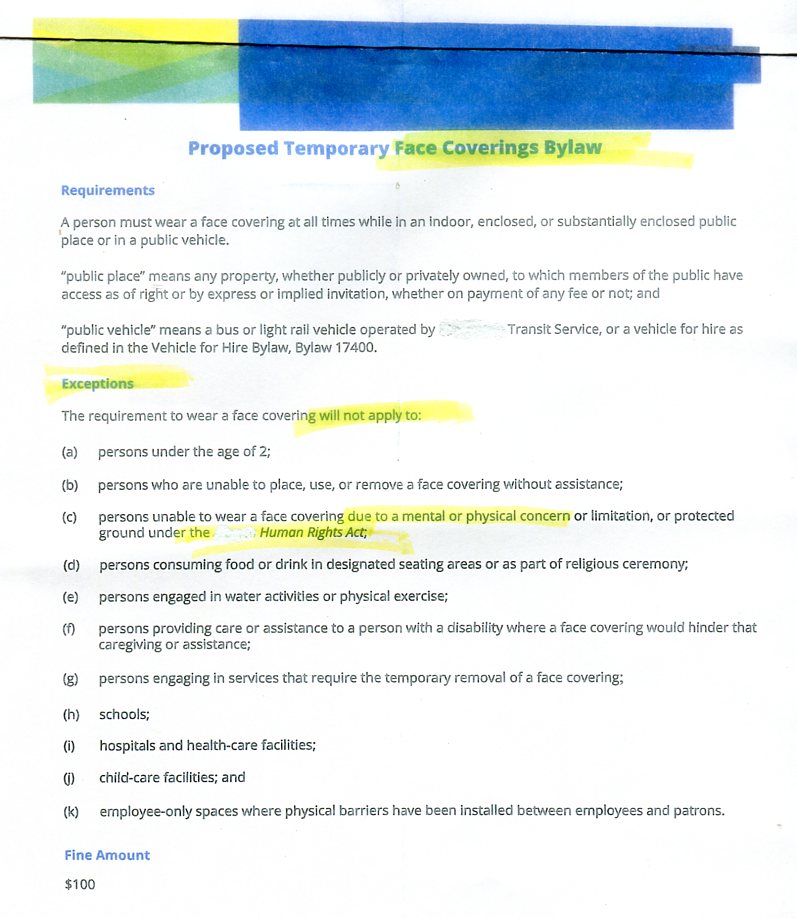 Exemptions to the mandatory mask order, Office of the Human Rights Commissioner (...You don't have to wear a mask because of a health condition or physical or mental impairment... If a person claims a mask exemption, take them at their word. Proof should not be required...