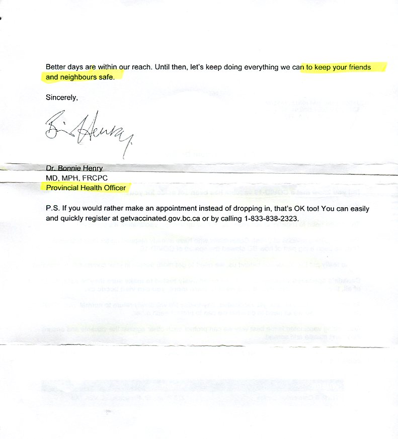 No mention is made, in the letter, that the signator, the top provincial health official, is being sued by citizens for misrepresenting the science and severity of COVID-19 and depriving citizens of their livelihood, rights and freedoms. Nor does the letter mention that her partner in crime, the top district medical officer, is on paid-leave** awaiting trial on charges of sexual child abuse.