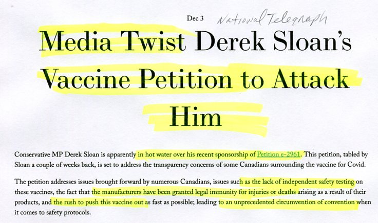 PetitionMediaTwist Media twist Derek Sloan's vaccine petition to attack him, National Telegraph, Dec 3, 2020