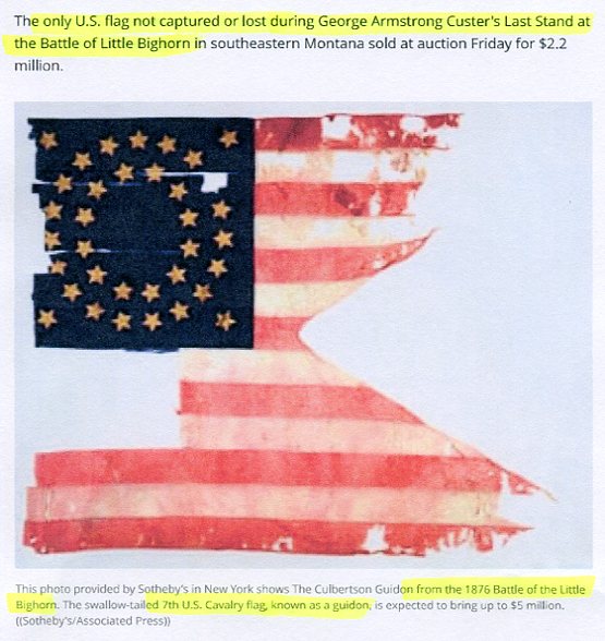"...Made of silk, measuring 33 inches by 27 inches, frayed, torn and with bloodstains, the Only U.S. flag not captured or lost during the Battle of Little Bighorn was found by Sgt Ferdinand Culbertson while on burial duty. The other flags were believed captured by the victorious Indians. As Custer's Last Flag it's a piece of Americana. The Detroit Institute of Arts paid $54 for it in 1895 but kept it hidden from public view. When in possession of the Little Bighorn Battlefield National Monument, the flag was poorly cared for and is now in horrible condition --"almost dust". Sealed in a custom-made plexiglass case by the Detroit museum since its return from the Park Service in 1982, the flag has several holes and the red of some its stripes has run into the white stripes. Its once-sharp swallow tail tips are now tattered and torn. The flag's also missing a star and a section of striping about 9 inches wide and 6 inches high -- apparently cut away as souvenirs."