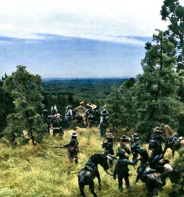 "...From the Crows Nest, a vantage point 14 miles away in the Wolf Mountains, Custer's Crows and Arikara scouts saw evidence of the massive Lakota, Cheyenne and Arapaho encampment. Convinced that he was discovered, Custer abandoned plans for a reconnaisance and a delayed attack. He divides his forces into 4 groups along Reno Creek deciding to strike the village before it could scatter...."