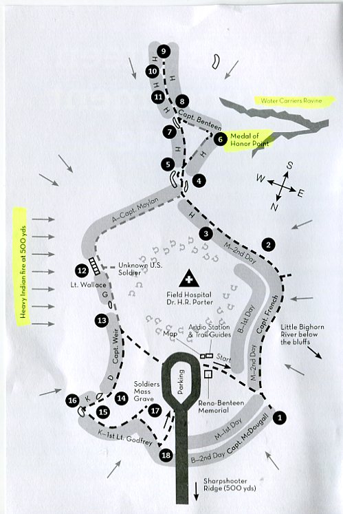 "...After retreating from the valley to the bluffs, Reno and his shattered command took positions in the vicinity of the present Reno-Benteen monument. Here Reno was shortly joined by Captain Benteen and his battalion and, soon afterward, by Captain McDougal and the pack train. After wiping out Custer 4 miles to the north, the Sioux and Cheyenne warriors laid siege to Reno at this site. The command, about 400 strong, entrenched in a rough circle around the saucer-like depression just south of the monument. In this sheltered swale, Dr Porter established the hospital. Beginning at the monument, Entrenchment Trail provides an interepretive tour of Reno's defensive positions...."
