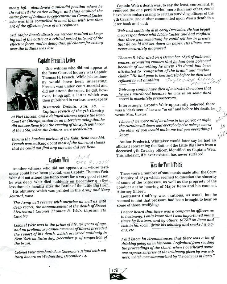 "...Another witness who did not appear, and whose testimony could have been pivotal, was Captain Thomas Weir. Weir did not attend the Reno Court of Inquiry for a very good reason: he was dead. Weir died suddenly on December 9, 1876, less than six months after the Battle of Little Big Horn... Captain Weir's death was, to say the least, convenient. It removed the one person who, more than any other, could have been embarassing to certain surviving officers of the 7th Cavalry. One author commented upon Weir's death in a later book said: "Weir took suddenly ill in early December. He had begun a correspondence with Libbie Custer and had confided that there was something he could tell her in private that he could not set down on paper. His illness was never accurately diagnosed. Thomas Weir died on 9 December 1876 of unknown causes, prompting rumors that he had been poisoned because of something he knew. His death has been contributed to 'congestion of the brain' and 'melancholia'. He had gone to bed shortly before he died and refused to eat anything'... Interestingly, Captain Weir apparently believed there was a 'dark secret' he was 'in on' and before his death, he wrote Mrs Custer: 'I know if we were all of us alone in the parlor, at night, the curtains all down and everybody else asleep, one or the other of you would make me tell you everything I know. Author Frederick Whittaker would later say he had an affidavit concerning the Battle of Little Big Horn from a deceased 7th Cavalry officer, identified as Captain Weir. This affidavit, if it ever existed, has never surfaced....
