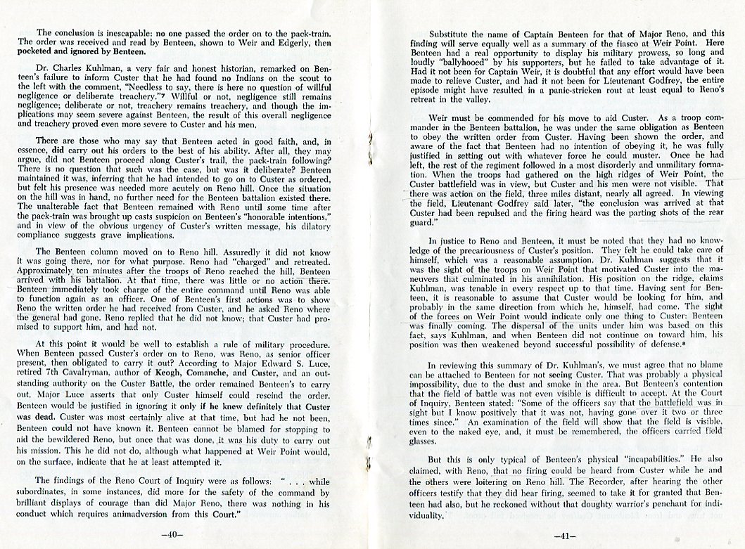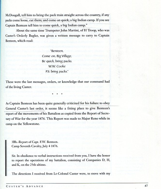 "...Approximately 10-minutes after the troops of Reno reached the hill, Benteen arrived with his battalion. At that time, there was little or no action there. Benteen immediately took charge of the entire command until Reno was able to function again as an officer. One of Benteen's first actions was to show Reno the written order he had received from Custer, and he asked Reno where the general had gone. Reno replied that he did not know; that Custer had promised to support him, and had not... The order remained Benteen's to carry out... Only Custer himself could rescind the order... Custer was most certainly alive at that time... It was Benteen's duty to carry out his mission. This he did not do... Had it not been for Captain Weir, it is doubtful that any effort would have been made to relieve Custer, and had it not been for Lieutenant Godfrey, the entire episode might have resulted in a panic-stricken rout at least equal to Reno's retreat in the valley.
