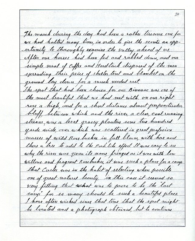 "...The spot that had been chosen for our bivouac was one of the most beautiful that we had met with.... It was easy to see why the river was given its name [Rosebud], fringed as it was with low willows and fragrant rosebushes. It was such a place for a camp that Custer was in the habit of selecting, when possible, one of great natural beauty. In this case it seemed so very fitting that what was to prove to be the "last camp" for so many should be such a beautiful place.