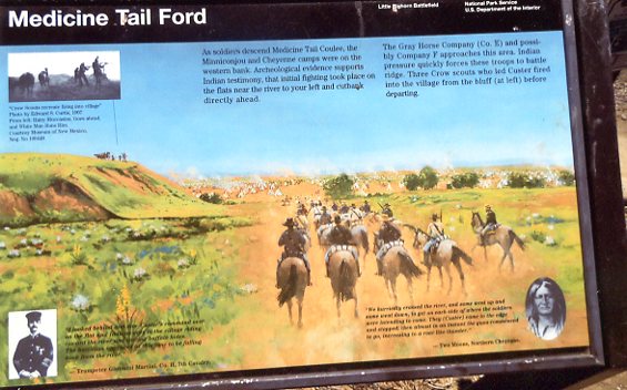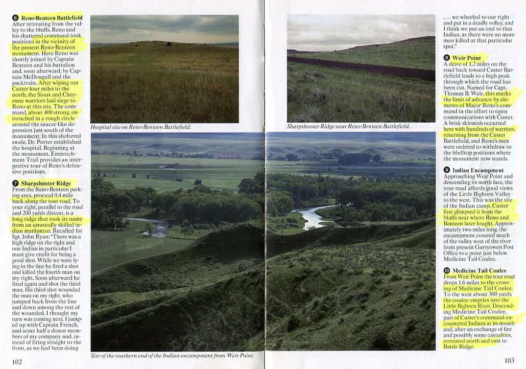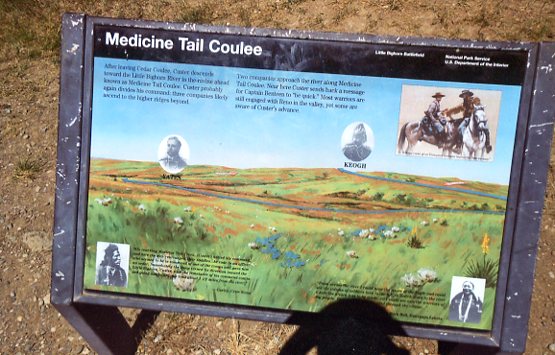 "...Descending the north face of Weir Point, the tour road affords good views of the Little Bighorn Valley to the west. This was the site of the Indian Camp, approximately 2 miles long. Custer first glimpsed it from the bluffs near where Reno and Benteen later fought... From Weir Point, the tour road drops 1.6 miles to the crossing of Medicine Tail Coulee. To the west about 300 yards the coulee empties into the Little Bighorn River. Descending Medicine Tail Coulee, part of Custer's command encountered Indians at its mouth and, after an exchange of fire and possibly some casualties, retreated north and east to Battle Ridge...."