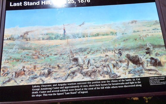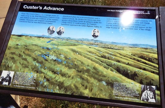 "...After separate skirmishing Custer's commands reunite here. Company L under Lt James Calhoun skirmishes here with Gall, Crow King, Two Moons and other warriors. From here these soldiers could have attracted Captain Benteen's column and the pack train. A Lakota and Cheyenne charge overruns this hilltop and stampedes Cavalry horses held in the ravine."
