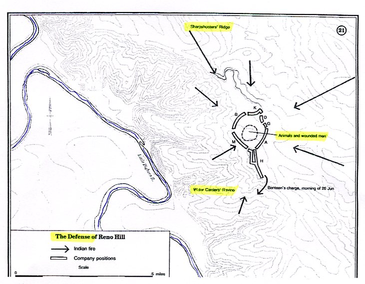 "...In an attempt to locate Custer Company D under Captain Thomas Weir advances to this hilltop position without orders late [actually it was 2:30 in afternoonon] June 25. Weir may have witnessed the conclusion of the battle [actually it was still in progress] 3 miles ahead. He is later joined by Captain Benteen and others. The Lakota and Cheyenne, returning after destroying all of Custer's immediate command, force these troops to abandon this position in favor of their hilltop defense one mile south."