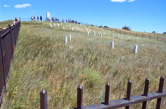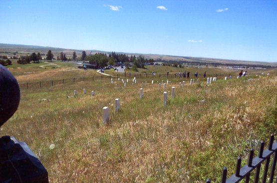 It was a profoundly eerie and awestriking moment seeing the tall granite monument -- the personification of Custer -- looming majestically ahead as the road climbed up and then circled around the back of Last Stand Hill. We drove down to the entrance-gate, parked and got out of the car to walk up the infamous hill. From the top of the hill was a panoramic view of the Little Big Horn valley from south to north of the village from where Custer planned to cross the river and attack.