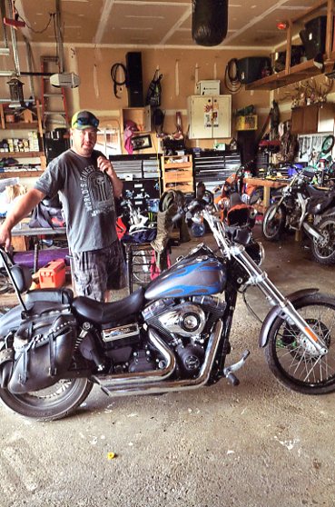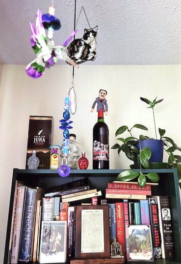 You can see the bottle, with puppet Orwell holding down the cork, on display atop the Lincoln shelf on the bookcase above photos of our family trip to Mount Rushmore in the late 1980s. My two sons are sitting on Lincoln's lap in the photo beside the pewter plaque of the Gettysburg Address and then a pic of the boys sitting in front of Mount Rushmore. Last summer 2022, while visiting my son, I snapped the above photo of him standing beside his Harley and it reminded me of the wooden motorcycle in Keystone -- so I placed the two side by side in the pic above.