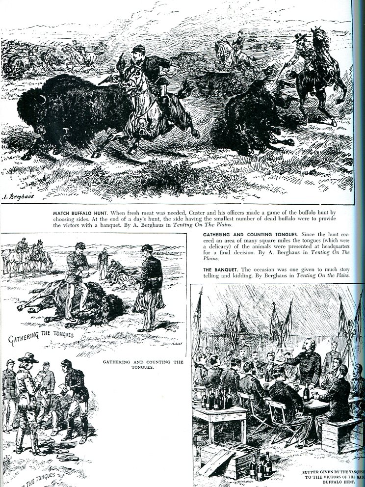 "...When fresh meat was needed, Custer and his officers made a game of the buffalo hunt by choosing sides. At the end of a day's hunt, the side having the smallest number of dead buffalo were to provide the victors with a banquet.... Before the advent of the rifle, the Indian preferred the bow and arrow. In some instances they would stampede buffalo herds over a cliff.... While chasing a buffalo, Custer's horse 'Custis Lee' veered as the buffalo turned suddenly. His cocked revolver was accidently fired into the brain of the horse. Thrown head over heels, and still retaining his revolver, Custer leaped to his feet to prepare for a fight or a footrace. The surprised buffalo looked him in the eye for a few moments, then galloped away..." [from The Custer Album by Frost]