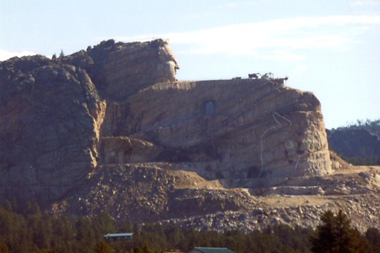 "...Now that he had command of the largest budget in Rushmore's history, Borglum in the spring of 1939 set out to hire the largest crew in its history... Borglum acquired a highly skilled sculptural assistant, thirty-year-old Korczak Ziolkowski.... Although he was almost entirely self-educated and self-taught, Ziolkowski's training had been good enough and his talent great enough that later in the summer of 1939 his bust of Paderewski [pianist & composer] would win a gold medal at the New York World's Fair... Following service in World War II, Ziolkowski returned to the Black Hills to stay. He came at the request of a group of Sioux Indians led by Chief Standing Bear, who had asked him to carve on a Black Hills mountain a monument honoring the country's original occupants. For this purpose, Ziolkowski personally bought, some ten miles south-west of Rushmore, a mountain whose top is a solid granite ridge. There, he began carving a statue of the Sioux war chief Crazy Horse, seated on a pony, and since his death in 1982 the work has been continued by his wife and children. This work is not being done in bas-relief as at Stone Mountain, nor as half-round figures on a cliff-face as at Rushmore. Rather it is the conversion of an entire mountain ridge into a single statue in-the-round. Because of this, and its gigantic size it is the most ambitious sculptural enterprise yet undertaken by man...."