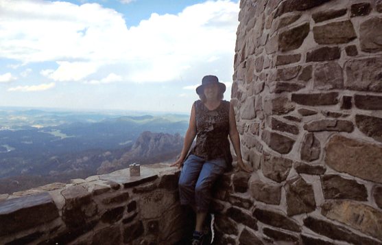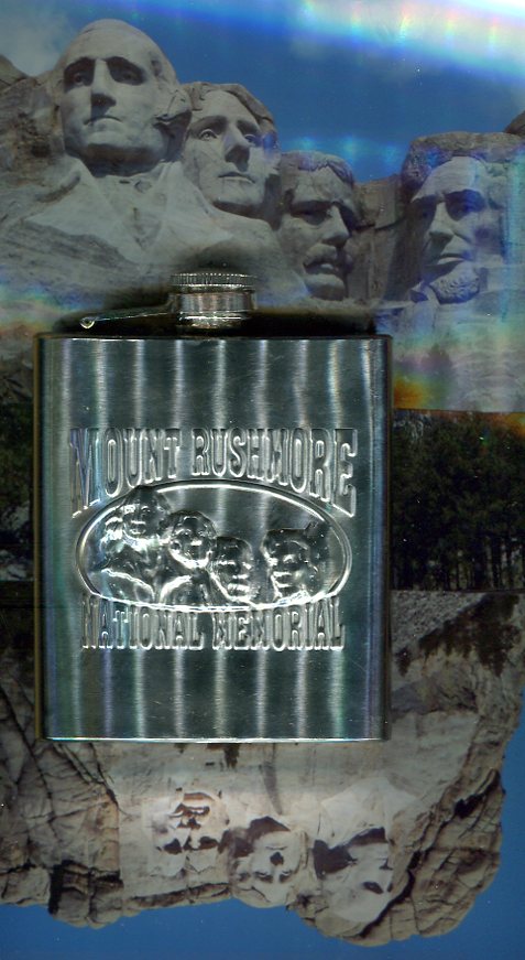 In that photo of me sitting on the stone wall, at the top of Harney Peak, I think (am not sure) that those mountains to my immediate right are the back of Mount Rushmore. That stainless steel flask beside me, with Mount Rushmore carved on its front (which I bought in Hill City on the way down from Deadwood) slides perfectly into my pocket and is the water-bottle I take on hikes. I love pulling it out and seeing the reaction on people's faces -- absolutely everyone thinks it's whisky.