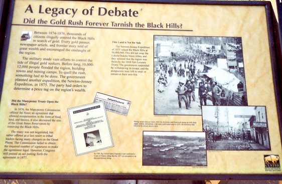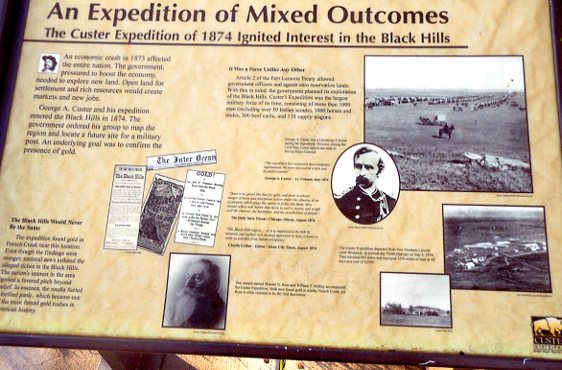 "...The expedition found gold in French Creek near this location. Even though the findings were meager, national news inflated the alleged riches in the Black Hills. The nation's interest in the area ignited a fevered pitch beyond belief. In essence, the media fueled a thrilled panic which became one of the most famed gold rushes in American history..."