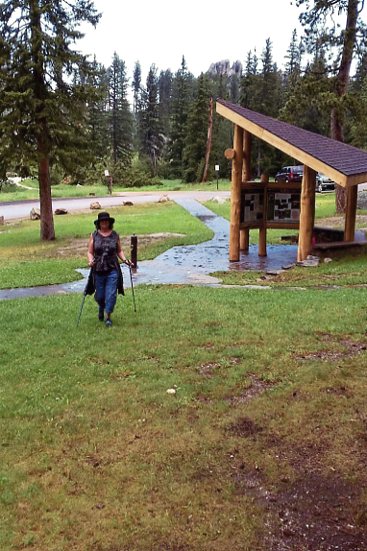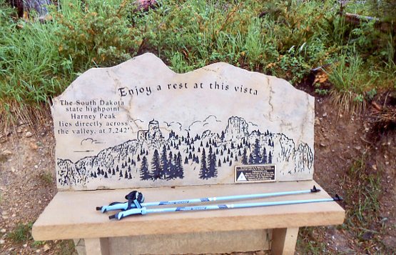 In the morning, after waking up in Custer Park, we had breakfast at the lodge and walked around the beautiful man-made (from a dam) Sylvan Lake. That's when we discovered, upon reading the storyboard, that we were at the base of Harney Peak -- the mountain Custer had climbed in 1874. Well, in less time than it takes to write these words (as Custer used to say) we were on the trail climbing to the summit -- a hike of 3-1/2 miles up and 3-1/2 miles down. This was right up my alley because walking is my main form of exercise and something I do every day using Nordic Walking poles -- which is like cross-country skiing without skis or snow. It uses upper and lower body -- the four-wheel-drive of walking -- and is good for posture, cardio and core.