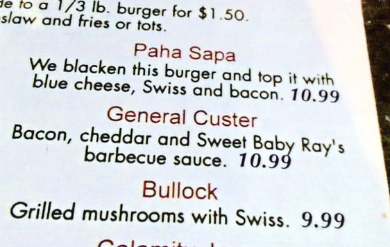 Upon arrival in Custer, there to greet us was our buffalo buddy. This time I wasn't wary of getting out of the car to pet him -- although one doesn't really pet a buffalo -- they are irresistably huggable and get hugged. That historic building behind buffalo's stomping ground is the original Dakota Territory Courthouse built in 1881 and now home to the Custer Museum. We walked around downtown Custer popping into stores and touristy places then went for dinner at a rustic-saloon-type restaurant we drove to. I wonder if anyone can guess what I ordered?