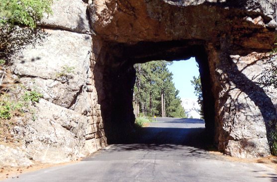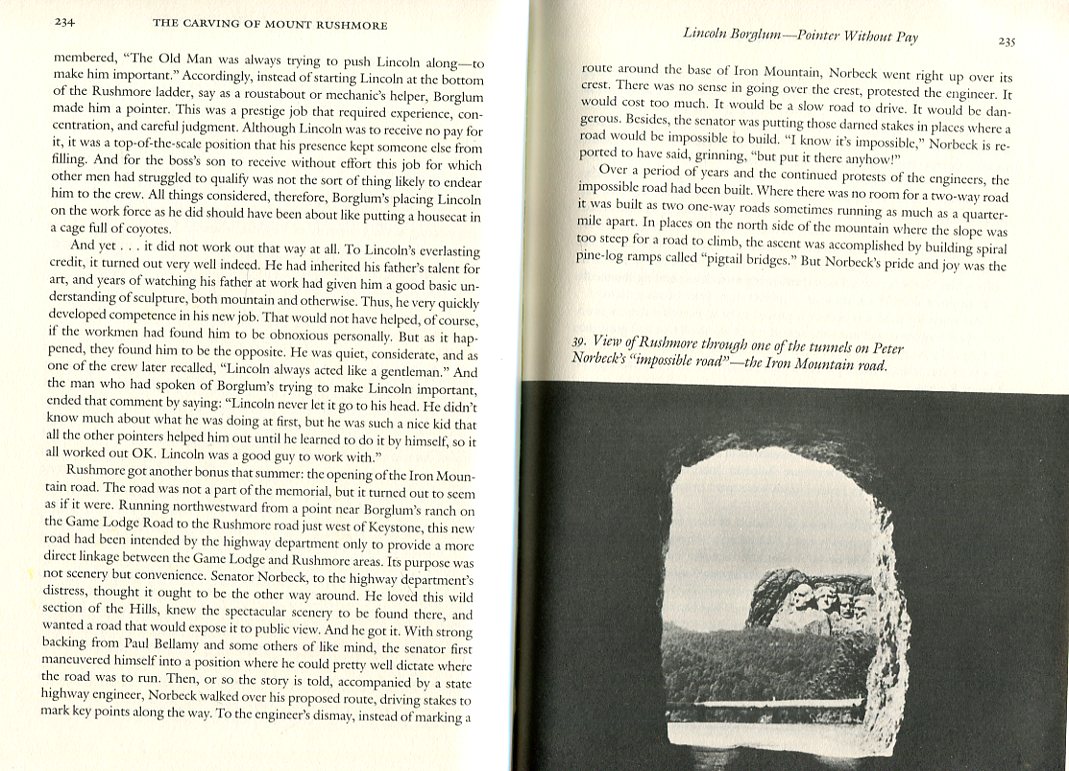 "...Over a period of years and the continued protests of the engineers, the impossible road had been built. Where there was no room for a two-way road it was built at two one-way roads sometimes running as much as a quarter-mile apart. In places on the north side of the mountain where the slope was too steep for a road to climb, the ascent was accomplished by building spiral pine-log ramps called 'pigtail bridges'. But Norbeck's pride and joy was the road's 3 tunnels. He had had an enormous amount of trouble in getting them dug, for the reason that all were entirely unnecessary. His files reveal many letters in which the state's engineers imply (politely, of course) that he had been out of his mind even to ask for them. Norbeck had responded by declaring that when it came to scenery, engineers 'don't know a park from a ranch', and he continued to insist that the tunnels be built.... When the road was opened it proved to be so beautiful that its problems were forgotten, and everyone agreed it was worth all that had gone into it. Especially Norbeck's tunnels! Each was so aligned that motorists entering it would see, framed like a picture in the tunnel's far end, the carvings on Mount Rushmore...."
