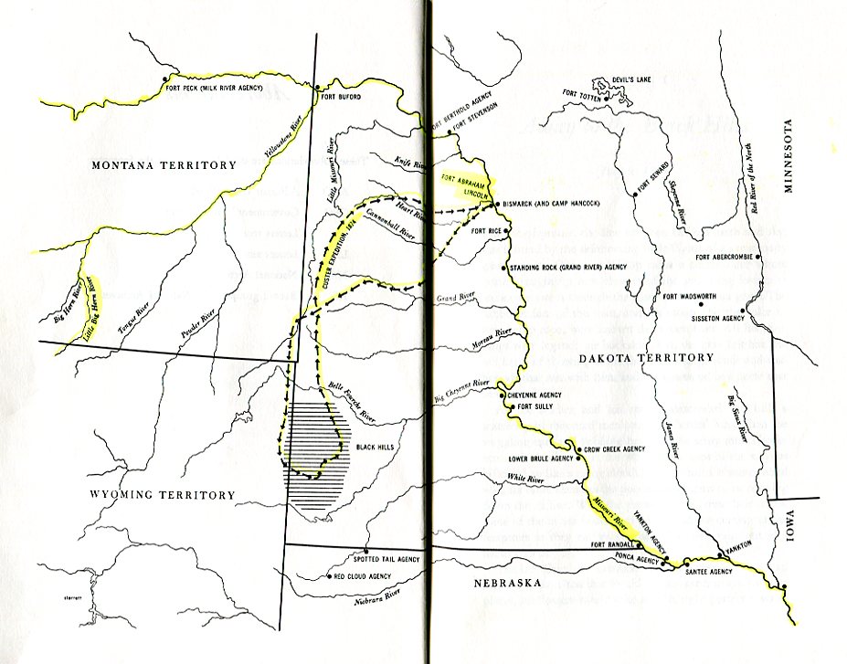 "...The white settlers had little interest in the semi-arid land assigned to the Sioux under the Treaty of 1868 and, for a time, the Indians enjoyed their domain in relative peace. However, when rumors spread that the Black Hills of the Dakota Territory were rich in gold, miners and newspapers wanted to organize prospecting parties. At first the government discouraged attempts to trespass upon the Sioux land, but under the pressure of public opinion, the Army in 1874 sent the 7th Cavalry Regiment, commanded by General George A Custer, to explore the Hills. With reports that gold had indeed been found by Custer, all hope of presesrving the Sioux treaty vanished. Miners flocked to the area despite attempts by the government to keep them out; by 1876, the Black Hills had been officially removed from Sioux control....