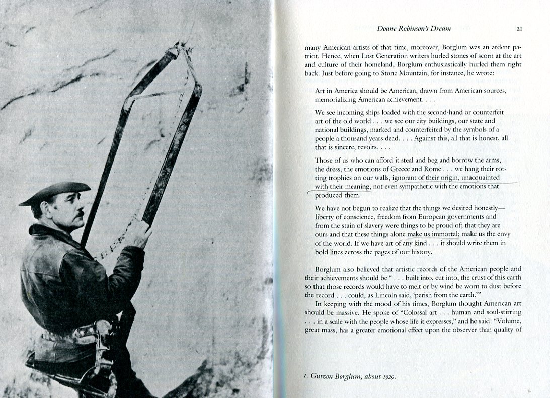 "...To such a time and national mood, the spirit of Gutzon Borglum was perfectly matched. Americans believed they were the world's best people, and made no secret of it. Borglum believed he was the world's best sculptor, and made no secret of that. Americans believed in the superiority of American art. Unlike many American artists of that time, moreover, Borglum was an ardent patriot... He wrote, 'Art in America should be American, drawn from American sources, memorializing American achievement... We have not begun to realize that the things we desired honestly -- liberty of conscience, freedom from European government and from the stain of slavery were things to be proud of; that they are ours and that these things alone make us immortal; make us the envy of the world. If we have art of any kind it should write them in bold lines across the page of our history'. Borglum also believed that artistic records of the American people 'should be built into, cut into, the crust of this earth so that those records would have to melt or by wind be worn to dust before the record could, as Lincoln said, 'perish from the earth''. In keeping with the mood of his times, Borglum thought American art should be massive. He spoke of 'Colossal art -- human and soul-stirring -- in a scale with the people whose life it expresses. Volume, great mass, has a greater emotional effect upon the observer than quality of form. Quality of form affects the mind; volume shocks the nerve or soul centers and is emotional in its effect. The heavy pipes in an organ will, rightly played, make everthing else on earth seem unimportant. Our age will some day be called the Colossal Age. Yet there is not a monument in this country as big as a snuff box. My big mission in life is to get people to look at art in a big way and to get away from this petty stuff'...."