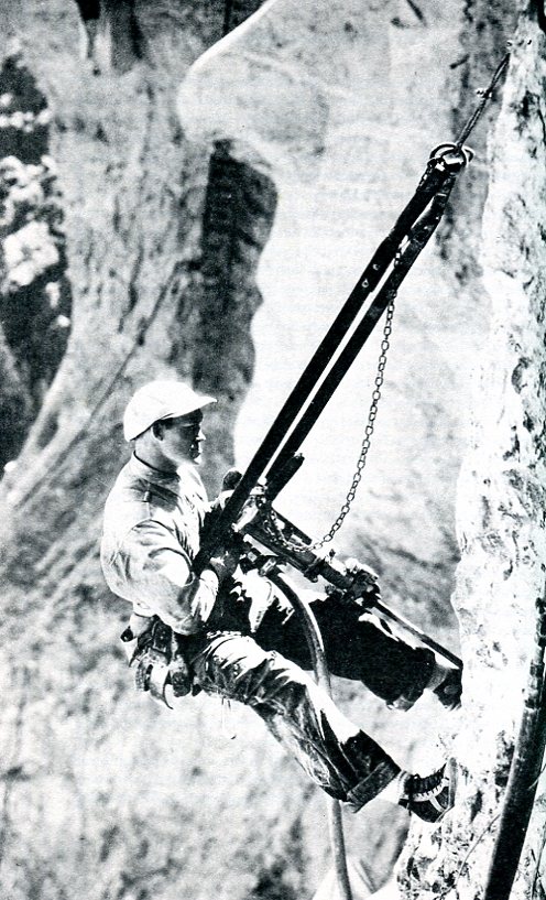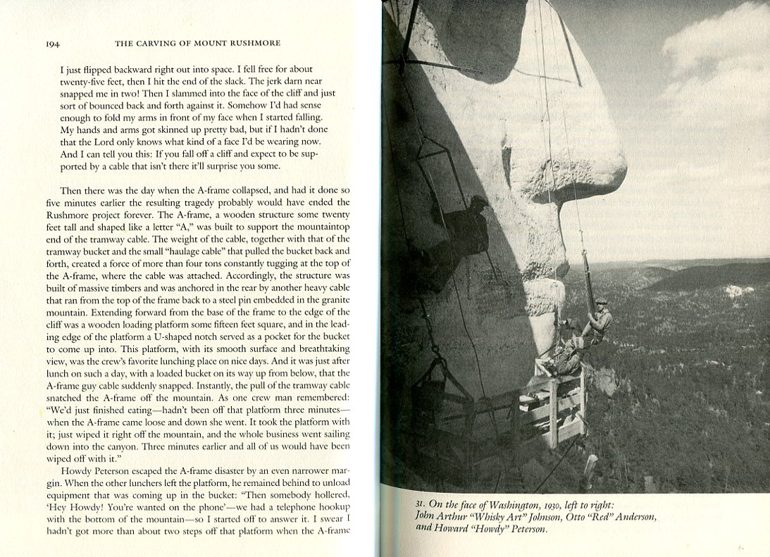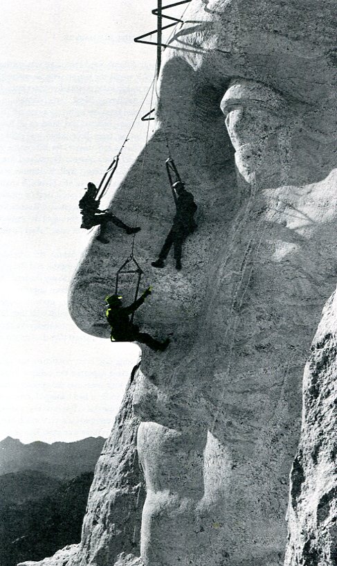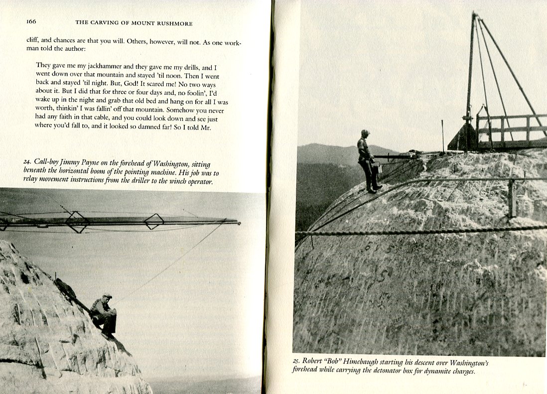 "...Your seat and its rigging were designed by Borglum himself... Also fastened to the arches on your seat is your safety belt: a broad leather strap that passes across your lower back and another that buckles across your front. This harness is perfectly safe. Once buckled in there is no way you can fall out of it; you know this in your head but not in your gut. The same with your cable -- 3/8ths of an inch in diameter, made of mild steel, capable of holding a 3-ton load -- which your head knows but not your gut, not yet anyhow. When you look up at that cable after first having taken a dizzying look into the canyon below, it seems a slender thread to hang a life on. Especially if that life is your own. These are things you must get used to if you are to work on the Rushmore cliff, and chances are that you will. Others, however, will not..."