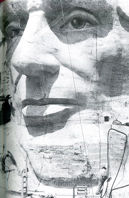 "...Borglum had brought the Roosevelt face to the point where by early summer of 1941 it was ready for dedication -- and in the process had scored another sculptural coup: the carving of Roosevelt's spectacles. They consist only of a carved nosepiece and a small ridge, suggestive of a frame, striped lightly across each of Roosevelt's upper cheeks. All the rest, in Borglum's words, 'is imagination'. But it is enough. To the monument viewer the spectacles are there, and they are complete..."