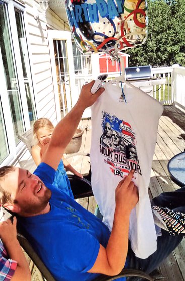 We and the grandchildren excitedly watched him unwrap our present -- a Mount Rushmore T-shirt.