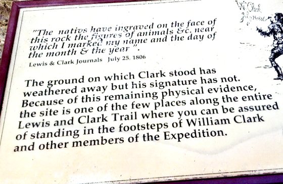In 1806, after Lewis & Clark reached the Pacific and were on their way back, retracing their route through the Continental Divide, they split into two expeditions. Lewis went north of the Missouri to explore the Marias river and Clark went south to explore the Yellowstone. Coming down from the Rockies -- with huge help from Sacagawea who had found the trail and the pass -- Clark's expedition entered the Yellowstone about 60 miles west of Billings. Then travelling downstream, on their right, a towering yellow sandstone rock jutted up from nowhere and they pulled over the canoes to explore. After Clark had climbed it he signed his name on the rock and gave it the name "Pompey's Pillar" after Sacagawea's 2-year-old son, Pomp.