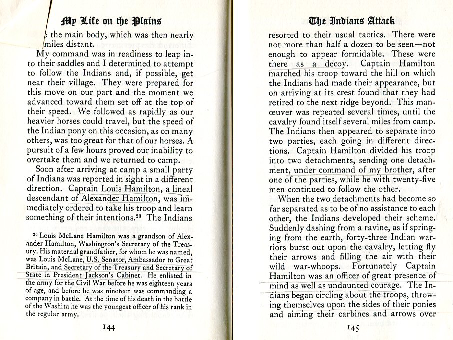 "...Before proceeding to narrate the incidents of the pursuit which led us to the battle of the Washita I will refer to the completion of our hasty preparations to detach ourselves from the encumbrance of our immense wagon train... The train was to be left behind under the protection of an officer and 80 cavalrymen, with orders to push after us, following our trail in the snow as rapidly as the teams could move... Under existing orders the guard for the protection of our train was each day under the command of the officer of the day, the tour of duty of the latter continuing 24-hours, beginning in the morning. On that day the duties of officer of the day fell in regular routine upon Captain Louis McLane Hamilton, 7th Cavalry, a grandson of Alexander Hamilton. Of course, this detail would require him to remain behind with the train while his squadron, one of the finest in the command, would move forward to battle under charge of another. To a soldier of Hamilton's pride and ambition to be left behind in this inglorious manner was galling in the extreme. He foresaw the situation at once, and the moment that intelligence of the proposed movement reached him he came galloping up from the rear in search of me. I was busily engaged at the time superintending the hurried arrangements for commencing the pursuit. Coming up to me with a countenance depicting the most earnest anxiety, his first words were to frame an inquiry as to whether I intended him to remain behind.