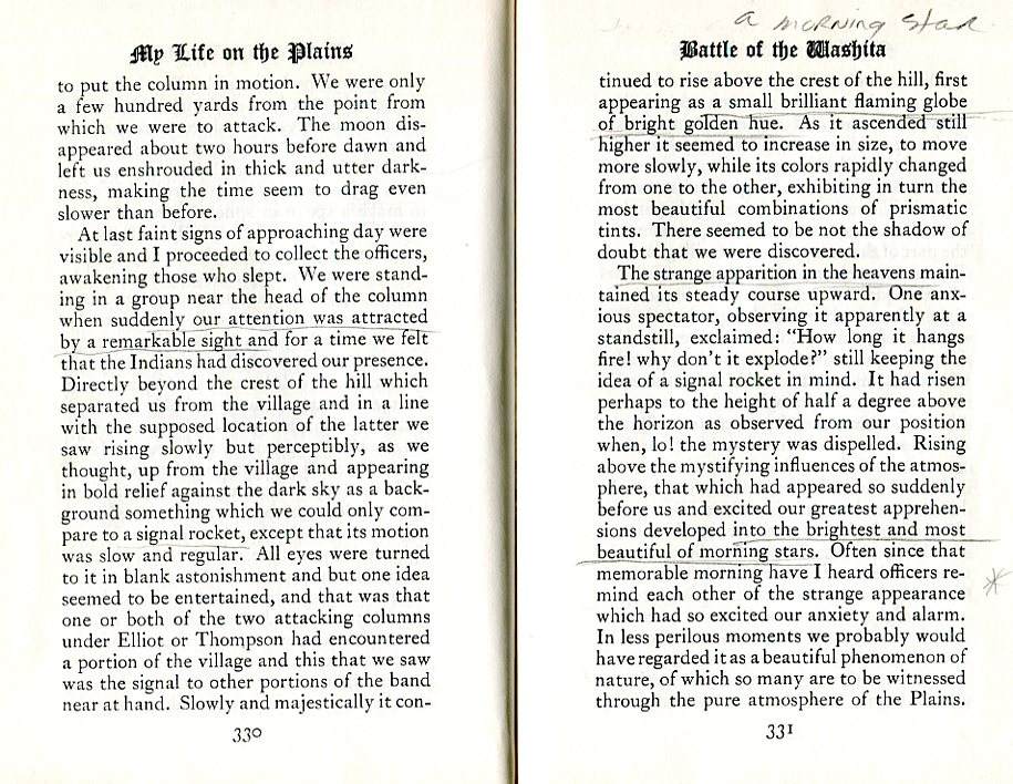 "...At last faint signs of approaching day were visible and I proceeded to collect the officers, awakening those who slept. We were standing in a group near the head of the column when suddenly our attention was attracted by a remarkable sight and for a time we felt that the Indians had discovered our presence. Directly beyond the crest of the hill which separated us from the village and in line with the supposed location of the latter we saw rising slowly but perceptibly, up from the village and appearing in bold relief against the dark sky as a background, something which we could only compare to a signal rocket, except that its motion was slow and regular.