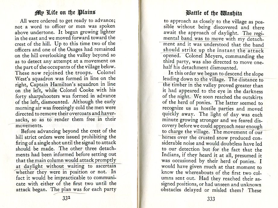 "...In this manner the battle of the Washita commenced. The bugles sounded the charge and the entire command dashed rapidly into the village. The Indians were caught napping; but realizing at once the dangers of their situation they quickly overcame their first surprise and in an instant seized their rifles, bows, and arrows, and sprang behind the nearest trees, while some leaped into the stream, nearly waist deep, and using the bank as a rifle-pit began a vigorous and determined defense. Mingled with the exultant cheers of my men could be heard the defiant war-whoop of the warriors, who from the first fought with a desperation and courage which no race of men could surpass. Actual possession of the village and its lodges was ours within a few moments after the charge was made, but this was an empty victory unless we could vanquish the late occupants, who were then pouring in a rapid and well-directed fire from ther stations behind trees and banks...