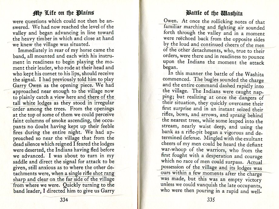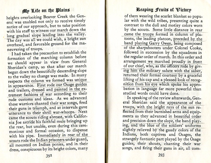 "...Immediately in rear of my horse came the band, all mounteed and each with his instrument in readiness to begin playing the moment their leader, who rode at their head and who kept his cornet to his lips, should receive the signal. I had previously told him to play Garry Owen as the opening piece. We had approached near enough to the village now to plainly catch a view here and there of the tall white lodges as they stood in irregular order among the trees... A single rifle shot rang sharp and clear on the far side of the village from where we were. Quickly turning to the band leader, I directed him to give us Garry Owen. At once the rollicking notes of that familiar marching and fighting air sounded forth through the valley and in a moment were re-echoed back from the opposite sides by the loud and continued cheers of the other detachments, who, true to their orders, were there in readiness to pounce upon the Indians the moment the attack began....