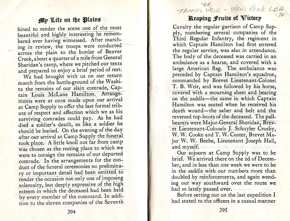 "...We had brought with us on our return march from the battle-ground of the Washita the remains of our slain comrade, Captain Louis McLane Hamilton. Arrangements were at once made upon our arrival at Camp Supply to offer the last formal tribute of respect and affection which we as his surviving comrades could pay. As he had died a soldier's death, so like a soldier he should be buried. On the evening of the day after our arrival at Camp Supply the funeral took place. A little knoll not far from camp was chosen as the resting place to which we were to consign the remains of our departed comrade... In addition to the 11 companies of the 7th Cavalry the regular garrison of Camp Supply, numbering several companies of the Third Regular Infantry, the regiment in which Captain Hamilton had first entered the regular service, was also in attendance. The body of the deceased was carried in an ambulance as a hearse, and covered with a large American flag. The ambulance was preceded by Captain Hamilton's squadron, commanded by Brevet Lieutenant-Colonel T.B. Weir, and was followed by his horse, covered with a mourning sheet and bearing on the sadde -- the same in which Captain Hamilton was seated when he received his death wound -- the saber and belt and the reversed top-boots of the deceased. The pall-bearers were Major-General Sheridan, Brevet Lieutenant-Colonels J Schuyler Crosby, W.W. Cooke, Beebe, Lieutenant Joseph Hall, and myself...."