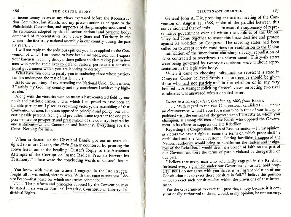 "...While Sheridan's plans -- which included Custer -- were being developed, Custer was active in reconstruction measures. While so engaged, he was bitterly assailed by some of the newspapers. In a letter to the Secretary of the United States Senate, August 30, 1866, these are Custer's words: