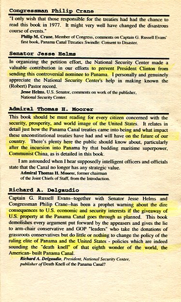 "...This book should be must reading for every citizen concerned with the security, prosperity, and world image of the United States. It relates in detail just how the Panama Canal treaties came into being and what impact these unconstitutional treaties have had and will have on the future of our country. There's plenty here the public should know abnout, particularly after the incursion into Panama by that budding maritime superpower, Communist China, as is detailed in this book...
