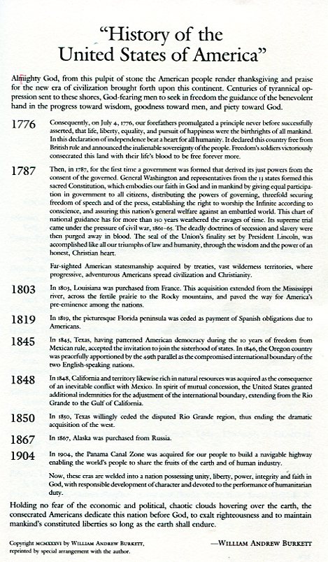 "...Borglum's plan for the Entablature, carved in 3-foot high letters, on a background the shape of the territory gained on the Louisiana Purchase...