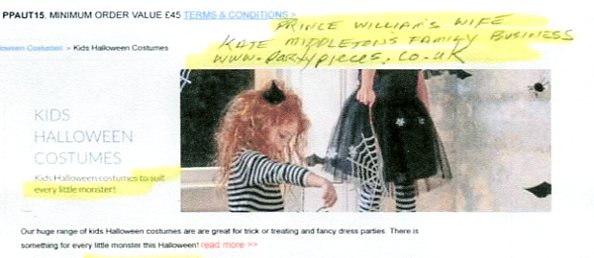 Evil magic and sorcery and bewitching and casting of spells on Royals is historical folk-lore over the centuries -- including throughout Shakespeare and long before his time. Some of the Halloween costumes for sale at PARTY PIECES seem to play on the devil theme and the Cobweb costume being black and spidery is witchy. Most shocking of all -- to find on a business connected to Prince William's wife -- is a costume displayed between a witch and devils -- the Cat Ears & Tail. The toddler model wearing it is a doppelganger for toddler Prince Harry, as in the photo of him being held by his mother. ~jj
