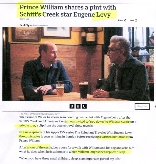 The Prince of Wales has been seen bonding over a pint with Eugene Levy after the SCHITT'S CREEK and AMERICAN PIE star was invited to "pop down" to Windsor Castle for a private tour, a clip from the actor's travel show reveals. In a new episode of his Apple TV+ series The Reluctant Traveler With Eugene Levy, the comic actor is seen arriving in London before receiving a written invitation from Prince William. After a tour of the castle, Levy goes for a walk with William and his dog and asks him what he does when he is at home; to which William laughs then replies: "Sleep. When you have three small children, sleep is an important part of my life"...