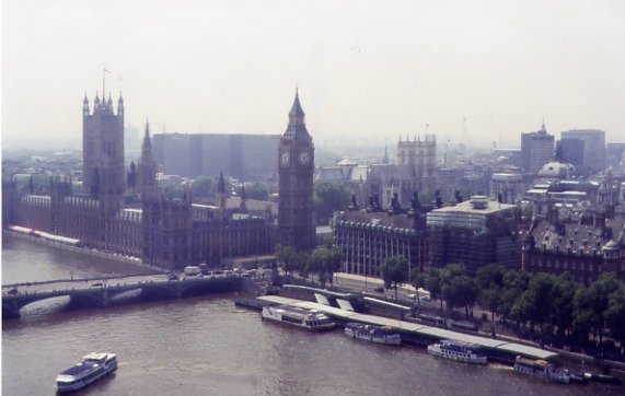 The above photo was taken from inside the Eye almost at the top. Down below is Westminster Bridge crossing the Thames to Big Ben. To the left are the Parliament Buildings culminating in the big tower. Looking behind Big Ben toward the centre can be seen the towers of Westminster Abbey.