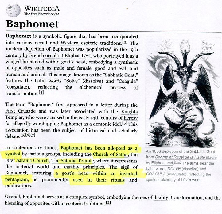 Baphomet has been adopted as a symbol for various groups including the Church of Satan, the First Satanic Church, the Satanic Temple, where it represents the material world and earthly principles. The sigil of Baphomet, featuring a goat's head within an inverted pentagram, is prominently used in their rituals and publications... See WITCHES, WIZARDS & DEMONS