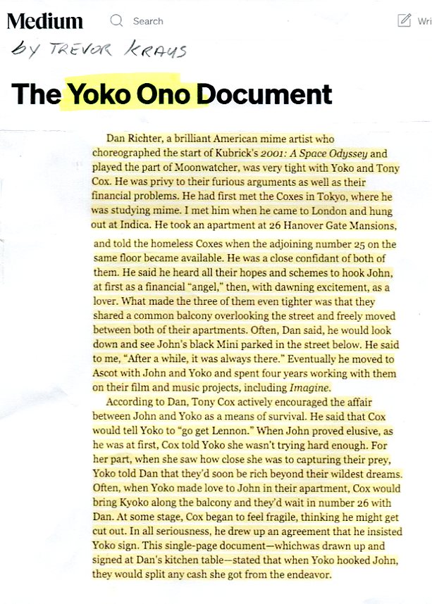 Dan Richter, a brilliant American mime artist who choreographed the start of Kubrick's 2001: A SPACE ODYSSEY and played the part of Moonwatcher, was very tight with Yoko and Tony Cox. He was privy to their furious arguments as well as their financial problems. He had first met the Coxes in Tokyo, where he was studying mime. I met Dan when he came to London and hung out at Indica. He took an apartment at 26 Hanover Gate Mansions, and told the homeless Coxes when the adjoining number 25 on the same floor became available. He was a close confidant of both of them [Yoko & Tony]. He said he heard all their hopes and schemes to hook John, at first as a financial "angel", then, with dawning excitement, as a lover. What made the three of them [Dan-Yoko-Tony] even tighter was that they shared a common balcony overlooking the street and freely moved between both of their apartments. Often, Dan said, he would look down and see John's black Mini parked in the street below. He said to me, "After a while, it was always there". Eventually Dan moved to Ascot with John and Yoko and spent four years working with them on their film and music projects, including IMAGINE. According to Dan, Tony Cox actively encouraged the affair between John and Yoko as a means of survival. He said that Cox would tell Yoko to "go get Lennon". When John proved elusive, as he was at first, Cox told Yoko she wasn't trying hard enough. For her part, when Yoko saw how close she was to capturing their prey, Yoko told Dan that they'd soon be rich beyond their wildest dreams. Often, when Yoko made love to John in their apartment, Cox would bring Kyoko along the balcony and they'd wait in number 26 with Dan. At some stage, Cox began to feel fragile, thinking he might get cut out. In all seriousness, he drew up an agreement that he insisted Yoko sign. This single-page document -- which was drawn up and signed at Dan's kitchen table -- stated that when Yoko hooked John, they would split any cash she got from the endeavour.