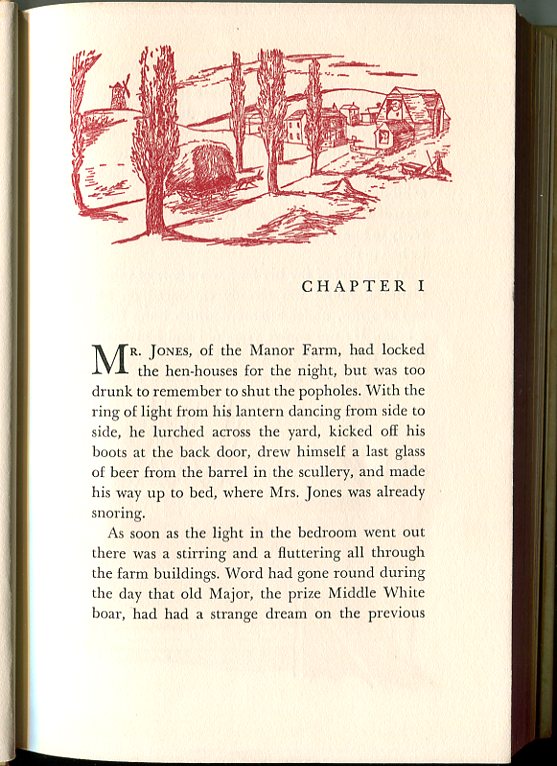 "Mr Jones, of the Manor Farm, had locked the hen-houses for the night, but was too drunk to remember to shut the popholes... As soon as the light in the bedroom went out there was a stirring and a fluttering all through the farm buildings. Word had gone round during the day that old Major, the prize Middle White boar, had a strange dream on the previous night and wished to communicate it to the other animals. It was agreed that they should all meet in the big barn as soon as Mr Jones was safely out of the way...". See MAJOR SPEECH IS ORWELL SPEAK
