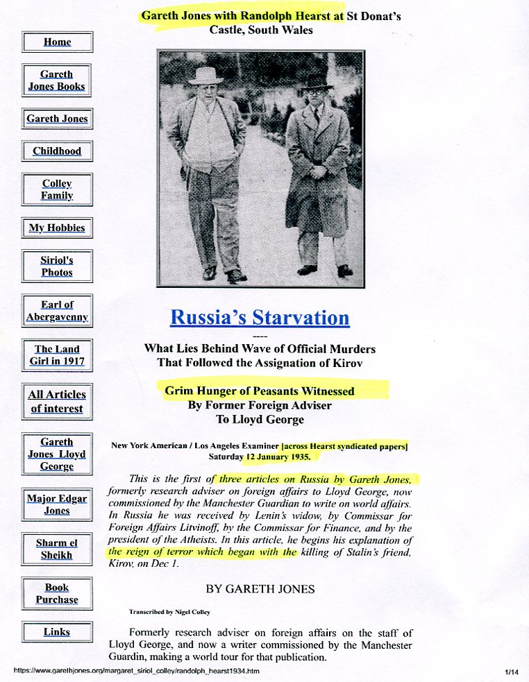 While in Moscow Jones associated with and quizzed the foreign reporters who were based there writing stories for their newspapers -- and one of them was Eugene Lyons who wrote the book ASSIGNMENT IN UTOPIA in 1937 exposing the truth, after the fact, of the famine and also of his regrets at having betrayed Gareth in 1933 when Jones's expose on the famine hit world-wide. But to protect their jobs, and stay in Stalin's good graces, all the reporters denied knowing what Jones was talking about. Orwell wrote a review of ASSIGNMENT IN UTOPIA in 1938 which proves he knew about what they'd done to Jones and that he'd read Jones's articles.