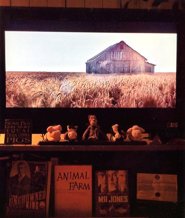I was captivated from the opening scene where, symbolically saluting ANIMAL FARM, we see pigs up close, grunting and shoving and greedily feeding at the trough. Then the camera takes us outside and in the distance looms "the big barn" and then slowly, slowly the camera zooms in closer and closer to a windowpane and behind that window we see, yes, yes, George Orwell -- typing and reading aloud the words he's writing. It brought back vivid memories of when I visited ORWELL'S WALLINGTON HOUSE and ORWELL'S ANIMAL FARM..